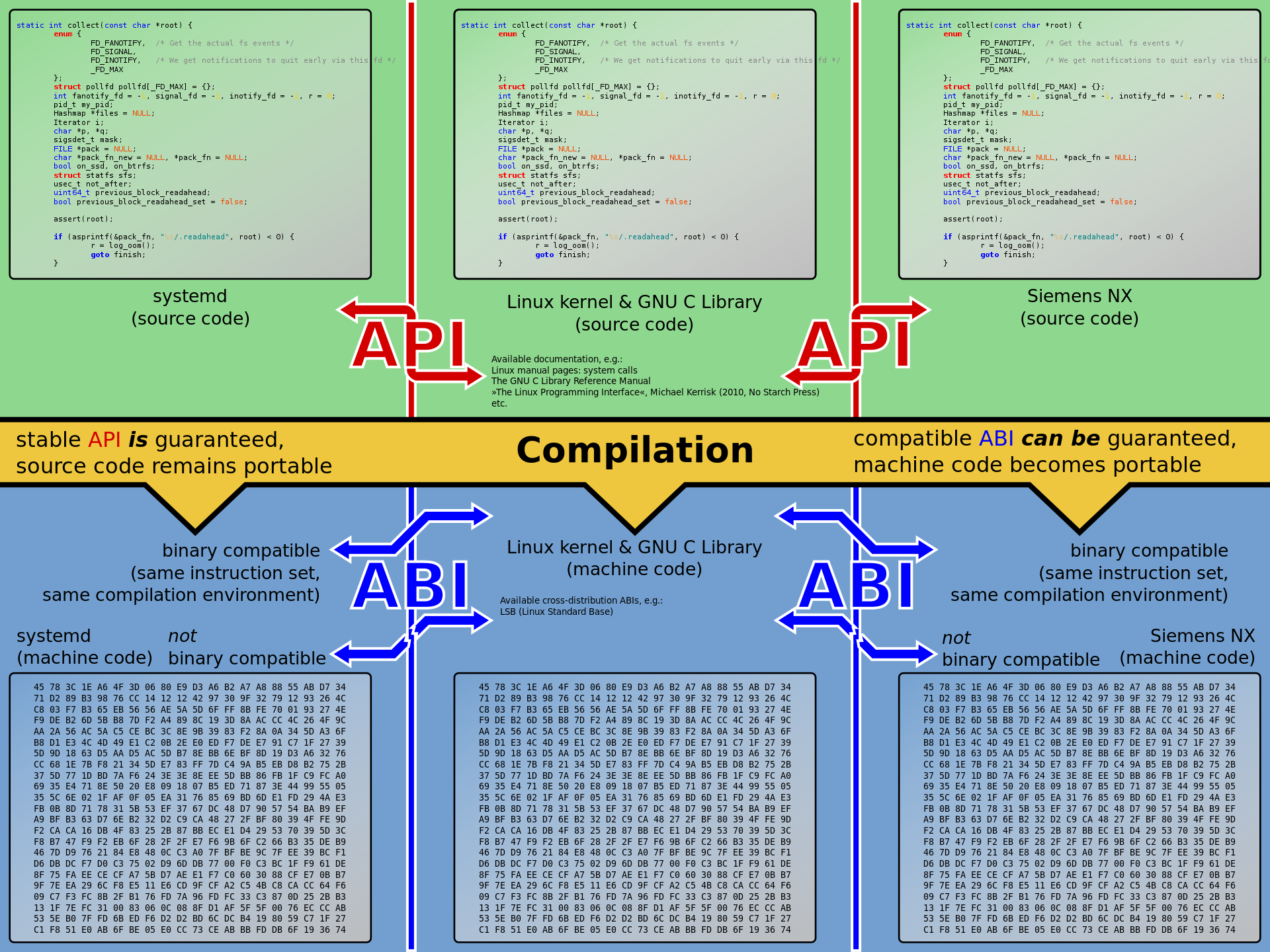 EABI를 지원하는 컴파일러는 다른 컴파일러에서 생성된 코드와 호환되는 개체 코드를 생성하므로 개발자는 한 컴파일러로 생성된 라이브러리를 다른 컴파일러로 생성된 개체 코드와 연결할 수 있습니다. 자체 어셈블리 언어 코드를 작성하는 개발자는 호환 컴파일러에서 생성된 어셈블리와 인터페이스할 수도 있습니다.
