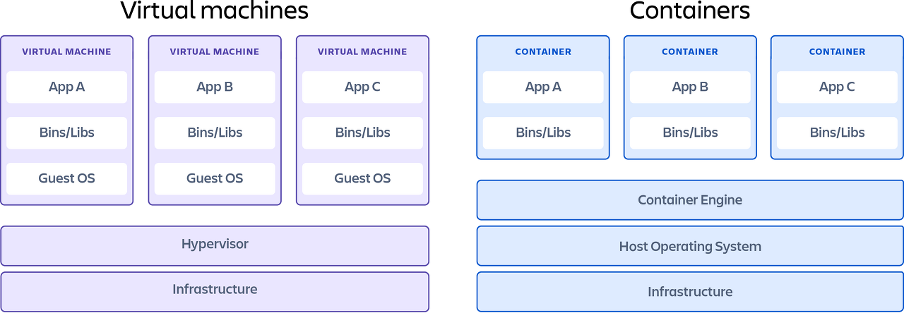 - Container : 가상화된 운영 환경, OS 위에 가상화된 어플리케이션 실행환경